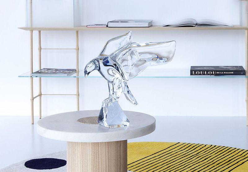 Perché sur un rocher, les ailes ouvertes, le bec pointé en avant, le regard perçant fixé sur une proie invisible, l’aigle est saisi dans une posture imposante. La réalisation de l’aigle impérial implique la création d’un moule en plâtre et d’un moule en argile, l’utilisation de fours spéciaux et un savoir-faire exceptionnel. La figurine est ensuite polie et lissée. L’aigle imperator existe en cristal clair et en cristal midnight. La version « aigle américain », moins épurée, donne des effets de lumière mouchetés.
