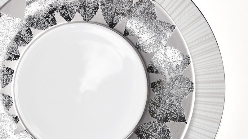 Ce nouveau décor tient son nom de la sylve, évocation poétique des arbres, maîtres de la forêt. C’est aussi une invitation à regarder de plus près la beauté de la nature : les nervures délicates du feuillage et les fibres végétales mises à jour habillent l’aile des assiettes, tour à tour en blanc sur blanc relief ou en platine.