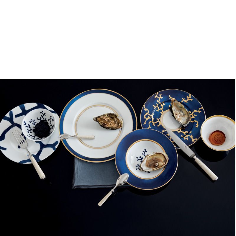 "Cristobal Marine" from Raynaud, with its organic shapes and intensive colors, will enhance and enliven your dining table. These variations of the popular, decorative Raynaud tableware "Cristobal Coral" celebrate Alberto Pintos’ famous coral branch shapes in a further transformation. In a variety of combinations of marine blue, intensive gold, and refreshing white, Cristobal Marine develops Pinitos’ delicate coral structures.