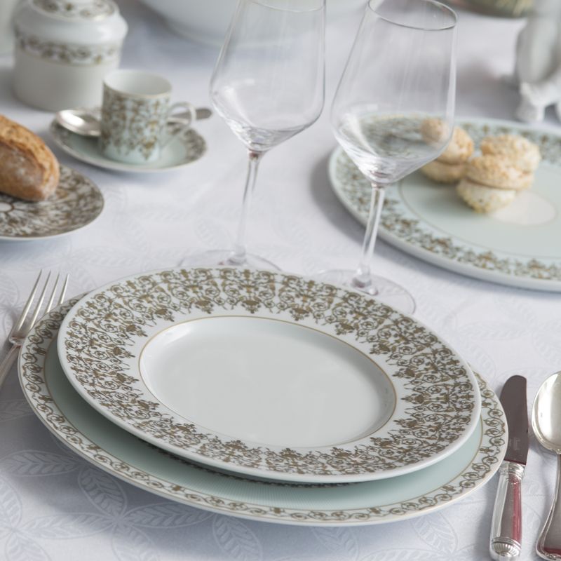 Cette gamme, inspirée du Palais des Tuileries, chef d'œuvre de l'architecture maintenant disparu, propose des couleurs douces teintées d'élégance telles que le blanc cassé ou le vert d'eau. Le motif représente les torchères qui permettaient, à l'époque, d'éclairer les jardins. Ce décors nous fait voyager au temps des splendeurs et les invite à votre table pour une mise-en-scène d'exception.