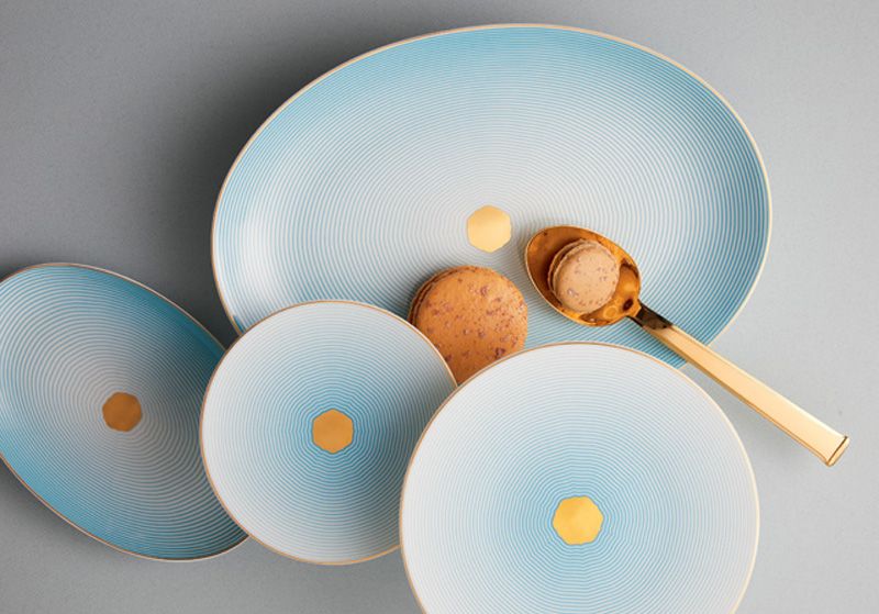 Inspiré de la porcelaine festonnée du XVIIIème siècle, Aura est une réinterprétation moderne et graphique des modèles d’antan. Une écriture douce et féminine, composée de traits intenses qui s’affinent vers des courbes plus légères et aériennes. Le filet et la pastille d’or viennent illuminer le bleu grisé du modèle. Le décor écrit ainsi une intensité colorielle subtile et élégante.