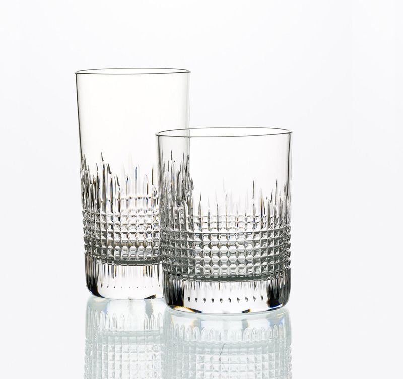 The Nancy Tumbler is characterized by its delicate crosshatching of lines etched into the base of the Baccarat Clear crystal highball glass.