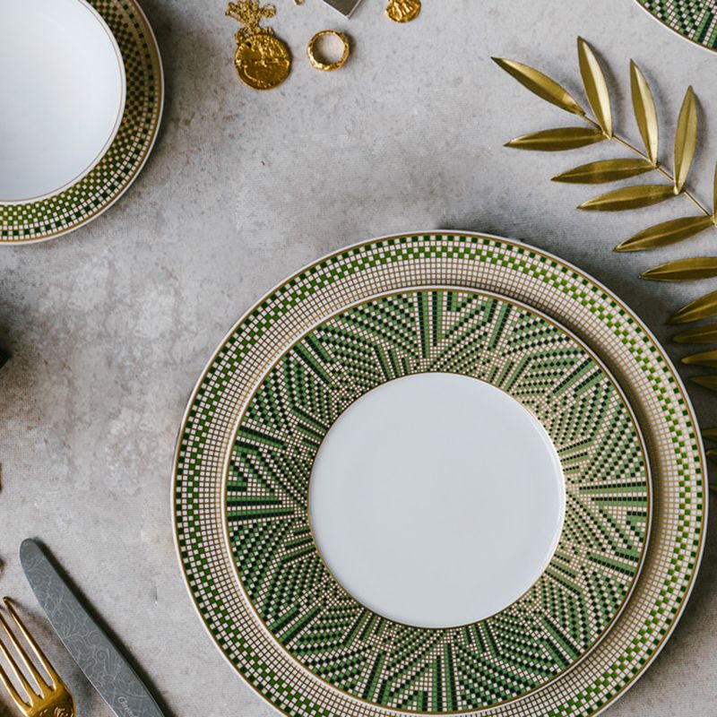 D’inspiration Art Déco, une mosaïque d’or, de vert tendre et vert émeraude se déploie en tapis et en frise. Durant cette période, c'est le retour à la rigueur classique après les volutes et les formes organiques de l'Art Nouveau. Les motifs sont simplifiés, réduits à des figures influencées par la géométrisation cubiste et les arts antiques, grecs ou romains. Le vert ou le jaune, associé au noir et au blanc sont des accords chromatiques particulièrement prisés. Le nom de la collection Augusta est un clin d’œil au nom que portait la ville de Limoges, berceau de la porcelaine française et de la manufacture Bernardaud, sous l’Empire Romain : Augustoritum.