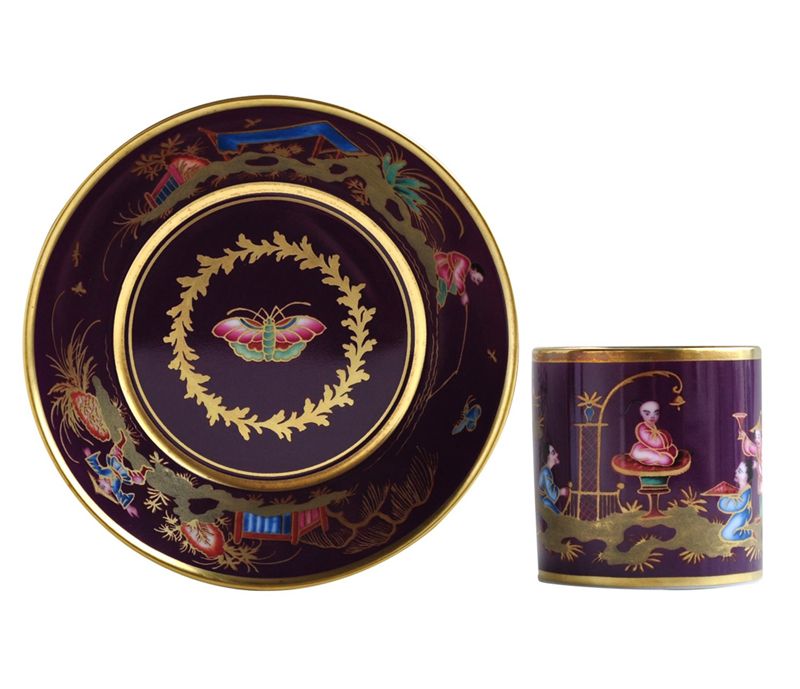The painter Denis Levé and the gilder Jean-Jacques Dieu marry diverse influences in this surprising creation by the Sèvres workshops. Here we find the purple color of the Meissen porcelain, Chinese images fashionable at the time and the abundant use of gold emblematic of Sèvres. An additional note of originality: this Chinese scene plays delightfully in a garden that perfectly imitates copper enamel objects.