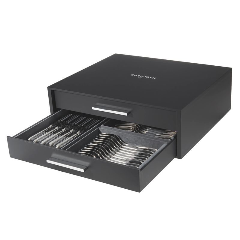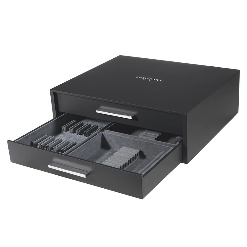 This storage chest has 2 drawers with modules included . You can store a 75-piece Christofle cutlery set in it. It can contain a maximum of 84 individual pieces (with easels) or 72 individual pieces (with easels) + a module for serving pieces (without easel) .