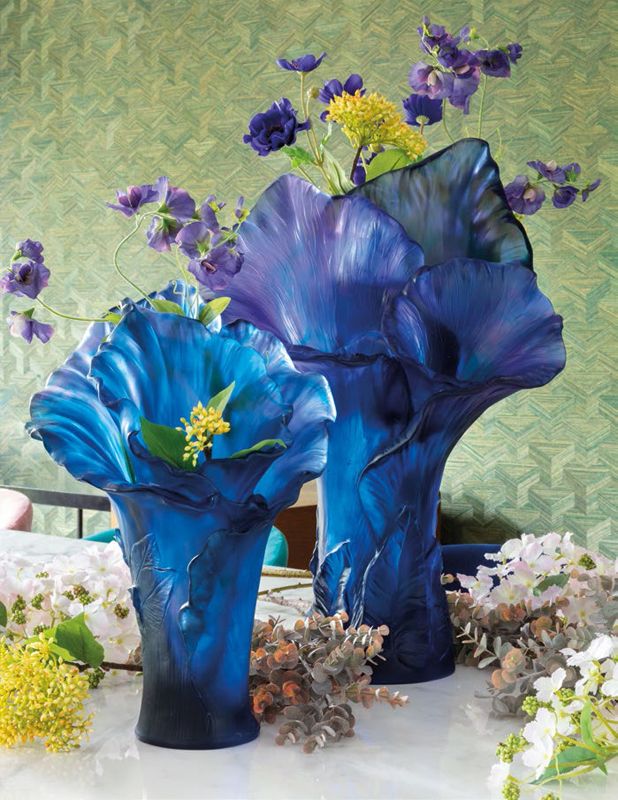la Maison Daum. Fleur de Méditerranée, de la famille des araceae, la Cristallerie crée une espèce magique où la matière épouse les courbes des fleurs. En vases, en coupe, en fleur à poser ou en flacon de parfum, Arum invite aux plaisirs de l’art floral. Un monde ou couleurs, senteurs et nature se côtoient pour former un paradis. Une poésie qui ne s’écrit qu’une saison dans l’année, c’est pourquoi Daum a souhaité la rendre immortelle. Dans cette collection le cristal joue avec les nuances de bleus, avec les formes élancées des généreuses corolles et les fleurs miniatures des flacons à parfum.