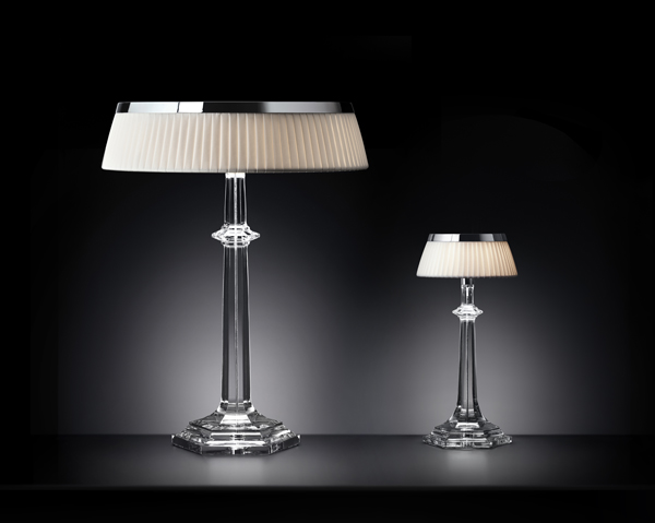 The BON JOUR VERSAILLES lamp sits on top of a finely sculpted transparent crystal or polymethacrylate stand whose lines are reminiscent of the Maison Baccarat most iconic pieces. Crowned with a chrome plate, the lamp features a unique and innovative LED Edge Lighting technology developed by Flos. This revolutionary system, coupled with an elegant lampshade in pleated fabric, allows the diffusion of warm and organic light that reveals spaces, thanks to an infinite optical play, and like a reflection of magical transparency, the lamp, bathed in light