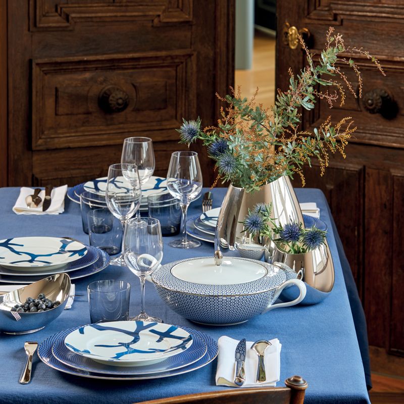 "Cristobal Marine" de Raynaud, avec ses formes organiques et ses couleurs intenses, sublimera et animera votre table. Ces variations de la vaisselle populaire et décorative de Raynaud "Cristobal Corail" célèbrent les célèbres formes de branches de corail d'Alberto Pintos dans une transformation supplémentaire. Dans une variété de combinaisons de bleu marine, d'or intense et de blanc rafraîchissant, Cristobal Marine développe les délicates structures coralliennes de Pintos.