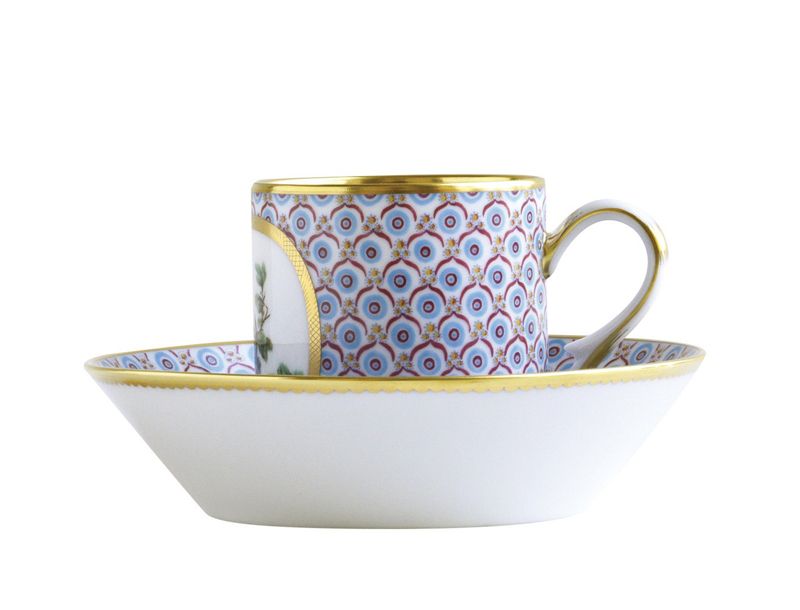 Édition à l’identique d’une tasse dite litron réalisée en 1769 par la manufacture de Sèvres. Ce décor singulier rappelle les célèbres planches d’oiseaux du naturaliste Buffon, qui se détachent ici sur un fond représentant un motif stylisé de plume de paon. On retrouve sur cette tasse les couleurs chatoyantes très appréciées à l’époque de Louis XV ; le bleu céleste et le rouge carmin. Que ce soit la « perruche à joüe rouge», ou le « Gay bleu d’Amérique », ils sont l’oeuvre de Chappuis. La délicatesse de ses couleurs et la finesse des paysages sont les marques de ce talentueux peintre animalier de la manufacture de Sèvres.