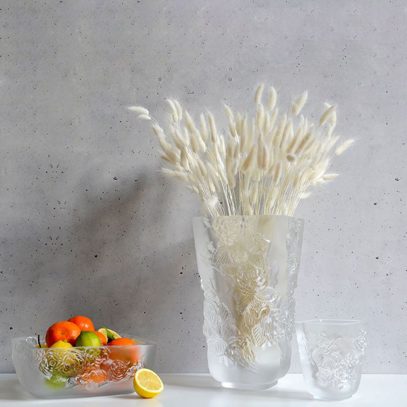 Alliance de force brute et de délicatesse, opposant forme carrée et lignes courbes des motifs sculptés, les vases et coupe Pivoines font contraster puissance minérale et douceur florale. Symbole de prospérité, de beauté et d’honneur, la pivoine est une fleur emblématique, notamment en Chine où elle est souvent représentée. Comme taillées à la gouge dans la roche, des guirlandes de fleurs prennent possession du cristal, à l’instar d’une nature luxuriante, reprenant ses droits sur des édifices à l’abandon. Leur modelé évoque également le procédé de sculpture à la Cire Perdue, lorsque l’artisan brise le moule de plâtre pour révéler la pièce.