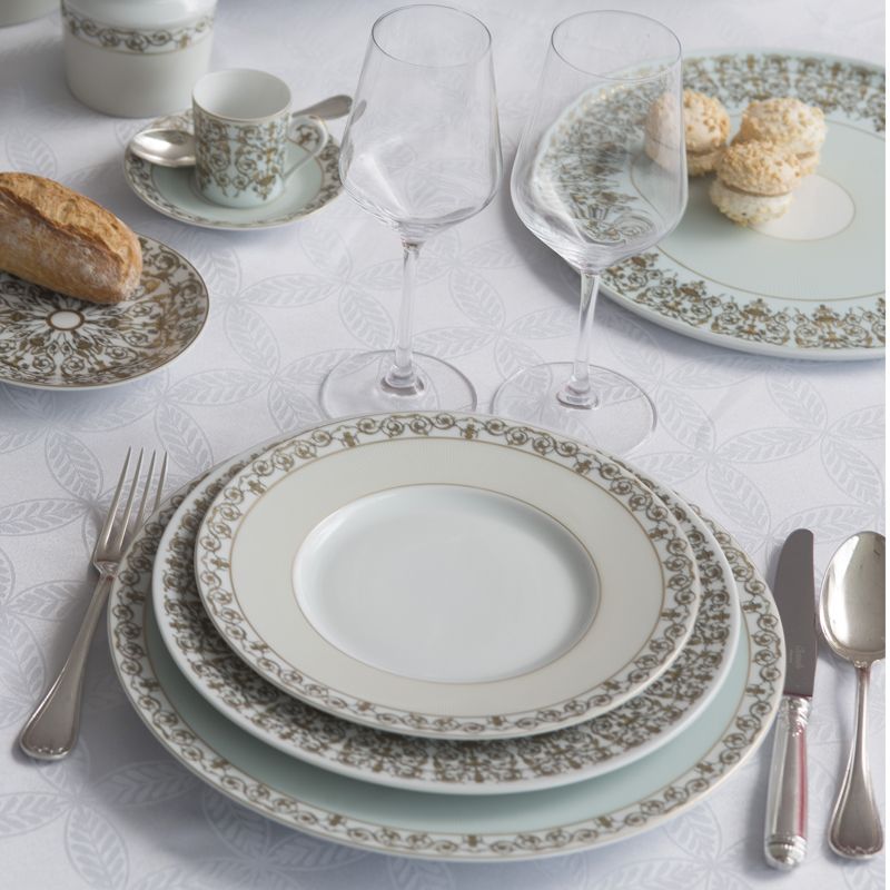 Cette gamme, inspirée du Palais des Tuileries, chef d'œuvre de l'architecture maintenant disparu, propose des couleurs douces teintées d'élégance telles que le blanc cassé ou le vert d'eau. Le motif représente les torchères qui permettaient, à l'époque, d'éclairer les jardins. Ce décors nous fait voyager au temps des splendeurs et les invite à votre table pour une mise-en-scène d'exception.