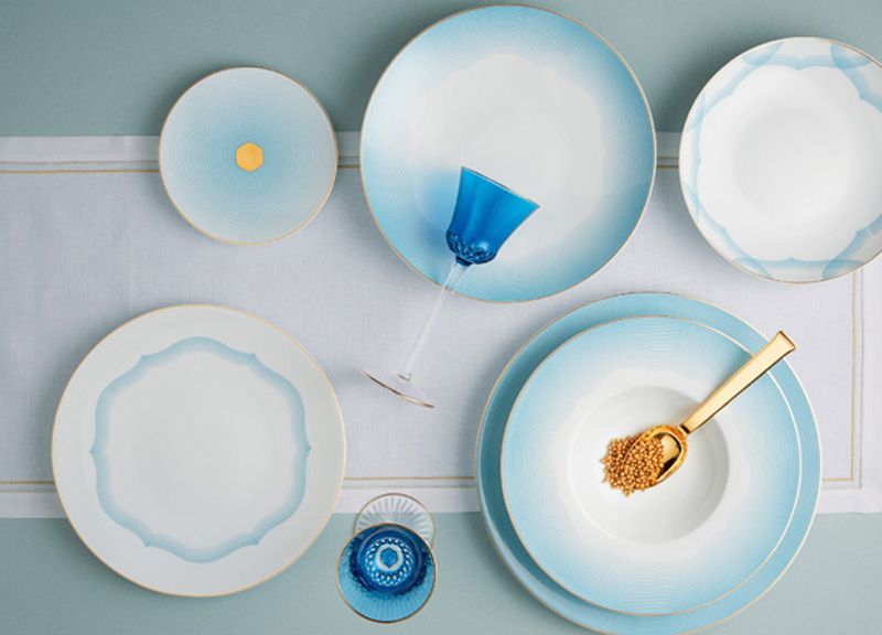 Inspiré de la porcelaine festonnée du XVIIIème siècle, Aura est une réinterprétation moderne et graphique des modèles d’antan. Une écriture douce et féminine, composée de traits intenses qui s’affinent vers des courbes plus légères et aériennes. Le filet et la pastille d’or viennent illuminer le bleu grisé du modèle. Le décor écrit ainsi une intensité colorielle subtile et élégante.