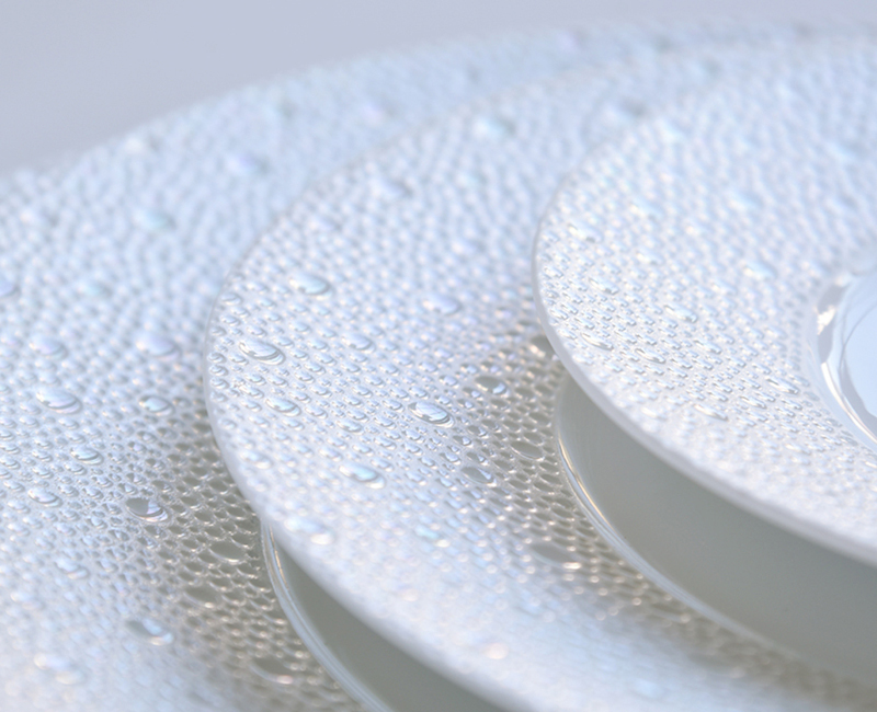 Un voile de nacre subtil a été posé sur les as¬siettes et les soucoupes de la collection Ecume permettant au décor de vibrer différemment grâce à cette irisation. Vous pouvez le décliner tel quel ou l'associer avec Ecume blanc.