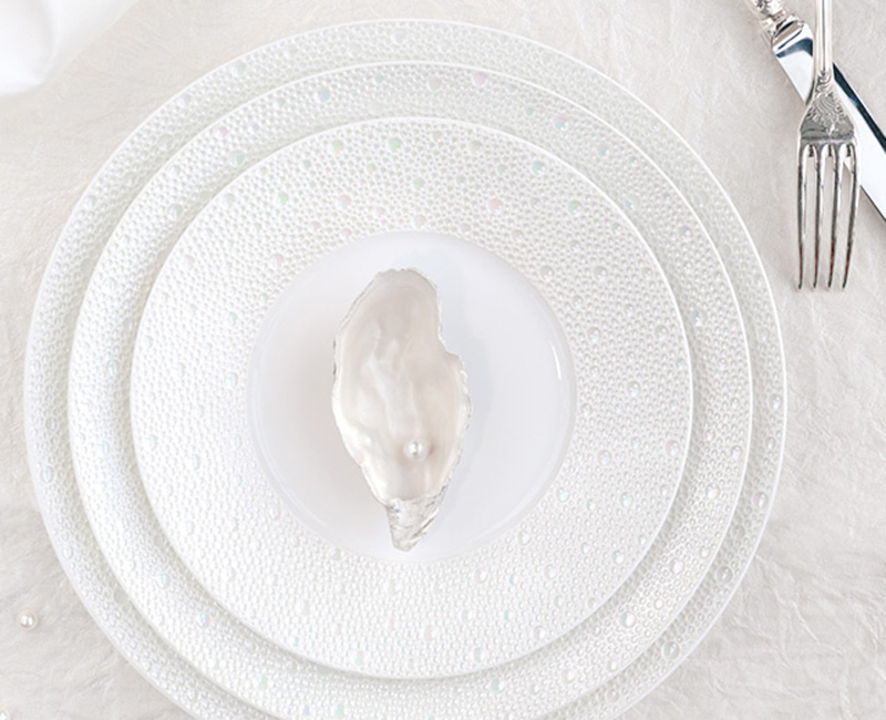 Un voile de nacre subtil a été posé sur les as¬siettes et les soucoupes de la collection Ecume permettant au décor de vibrer différemment grâce à cette irisation. Vous pouvez le décliner tel quel ou l'associer avec Ecume blanc.
