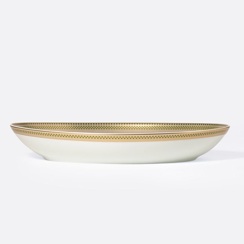 Art Deco inspired, a mosaic of gold, soft green and emerald green is deployed in carpets and friezes. During this period, there was a return to classical rigor after the volutes and organic forms of Art Nouveau. The motifs are simplified, reduced to figures influenced by cubist geometrization and ancient, Greek or Roman arts. Green or yellow, combined with black and white, are particularly popular color combinations. The name of the Augusta collection is a nod to the name of the city of Limoges, cradle of French porcelain and the Bernardaud factory, under the Roman Empire: Augustoritum .
