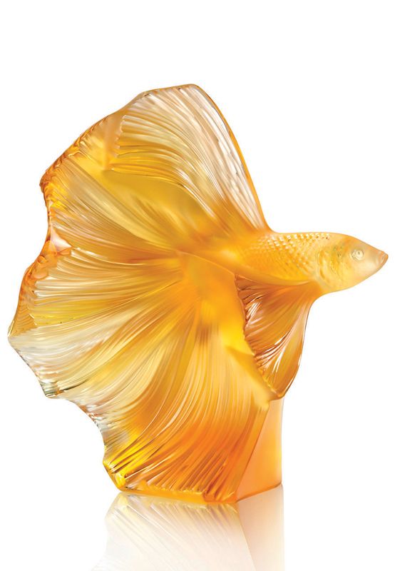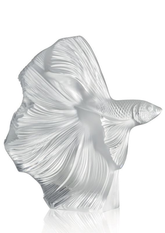 Mis en valeur par le cristal, le Poisson Combattant Lalique joue les jeux de reflets et de transparences. Originaires du Sud-Est asiatique, ces poissons belliqueux peuvent se livrer des combats mortels d'une violente beauté. Semblables à des voiles colorés, leurs amples nageoires ondulent et s'entremêlent dans un spectaculaire ballet aquatique.