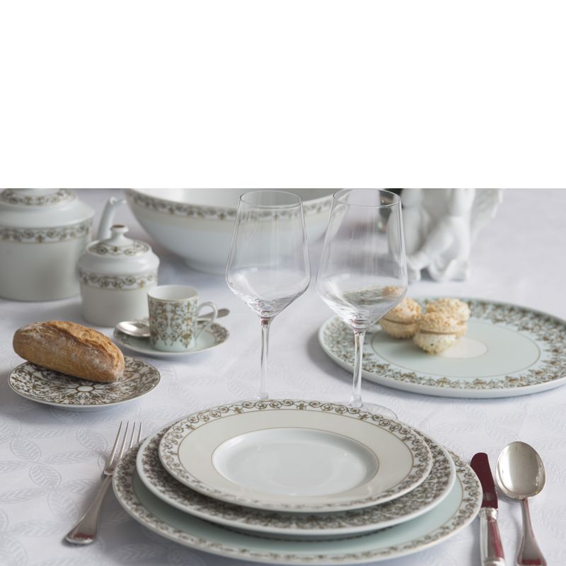 Cette gamme, inspirée du Palais des Tuileries, chef d'œuvre de l'architecture maintenant disparu, propose des couleurs douces teintées d'élégance telles que le blanc cassé ou le vert d'eau. Le motif représente les torchères qui permettaient, à l'époque, d'éclairer les jardins. Ce décors nous fait voyager au temps des splendeurs et les invite à votre table pour une mise-en-scène d'exception.
