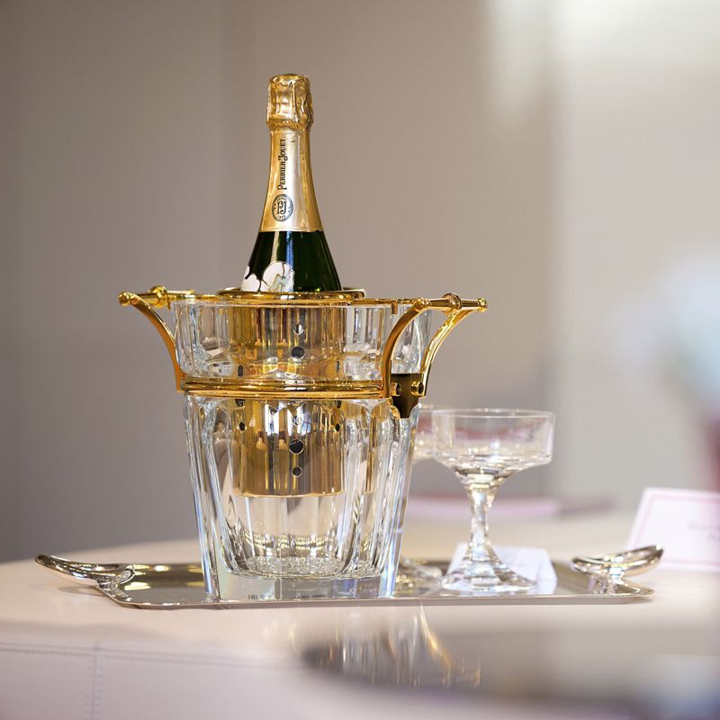 Symbole de l'élégance, le champagne se pare ici du plus bel écrin possible. Le seau à champagne Harcourt réhausse la pureté du cristal clair par des poignées argentées ou dorées qui en font un élément de table luxueux.