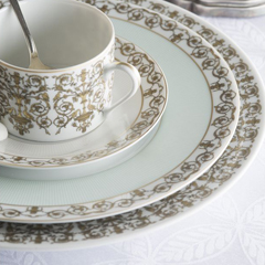Cette gamme, inspirée du Palais des Tuileries, chef d'œuvre de l'architecture maintenant disparu, propose des couleurs douces teintées d'élégance telles que le blanc cassé ou le vert d'eau. Le motif représente les torchères qui permettaient, à l'époque, d'éclairer les jardins. Ce décors nous fait voyager au temps des splendeurs et les invite à votre table pour une mise-en-scène d'exception.