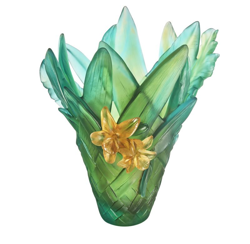 Feuilles de bambou, bananier, cocotier, des Caraïbes à l’Indonésie en passant par Madagascar, le tressage de ces feuilles est un véritable art de la vannerie. Savoir-faire ancestral ne nécessitant que des feuilles fraîches et une excellente dextérité, il sert au quotidien au travers de paniers, corbeilles, chapeaux, clôtures et décoration. Pour rappeler l’exotisme des îles dont le tressage est toujours d’usage, ces fleurs de vanille viennent décorer et parfaire ces œuvres de patience et de beauté.