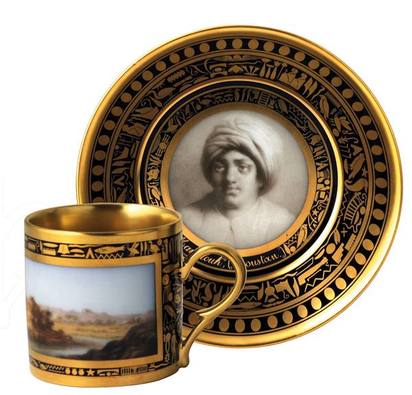 Réédition à l’identique de ce service à café de style égyptien exécuté par la manufacture de Sèvres fut livré au palais des Tuileries le 31 mars 1810, pour le mariage de Napoléon et de Marie-Louise. La soucoupe est ornée du portrait du mamelouk Roustan, garde du corps et valet de chambre au service de Napoléon de 1799 à 1814. Napoléon appréciait beaucoup ce service qu’il emporta en exil à Sainte-Hélène.